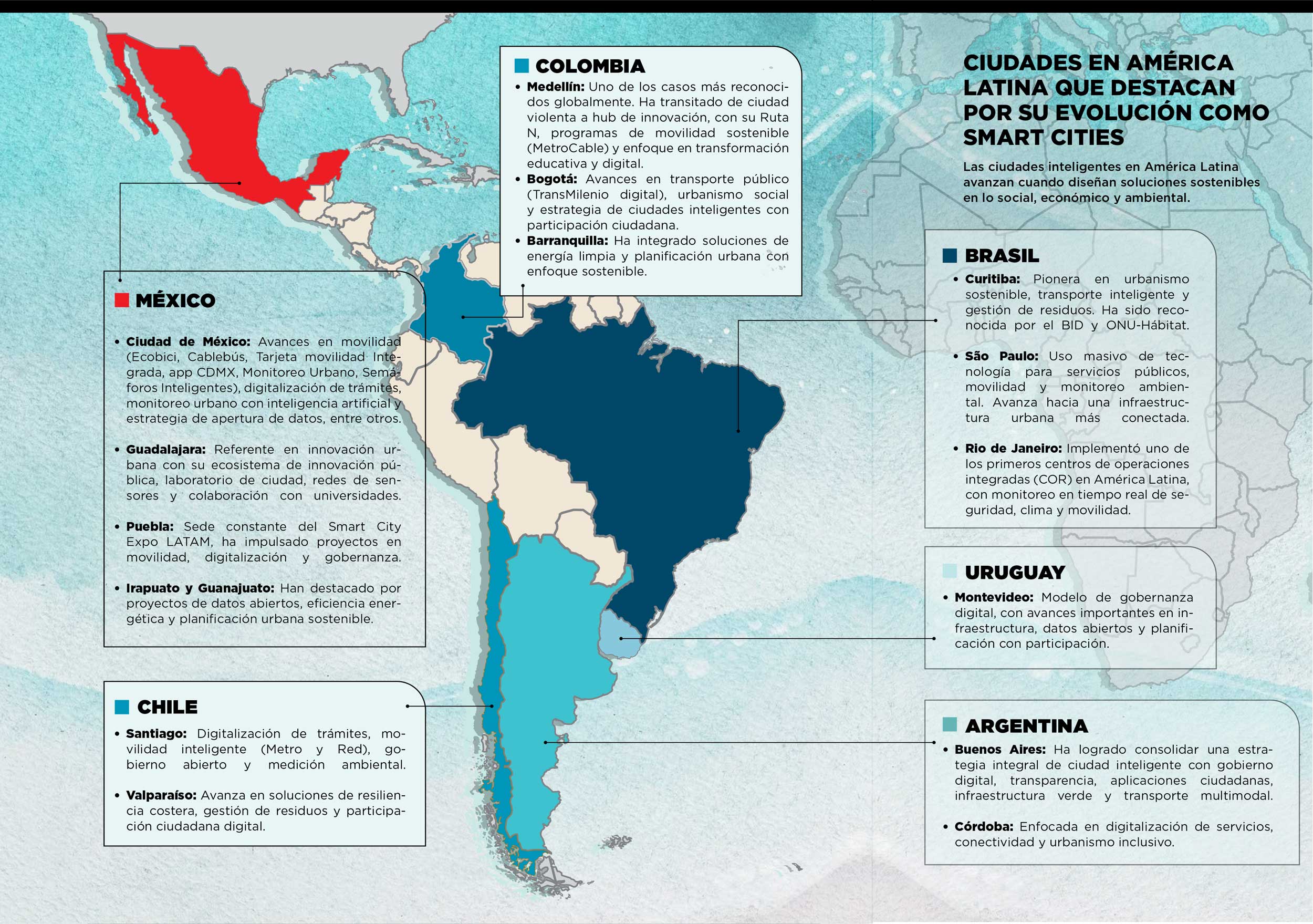 En los recuadros describimos algunas de las ciudades de América Latina que destacan por estar en una trayectoria sólida de evolución como Smart Cities, no necesariamente por ser “100% inteligentes”, sino por su avance en gobernanza digital, sostenibilidad, inclusión, movilidad y uso de datos.