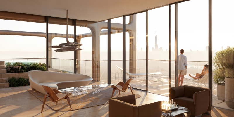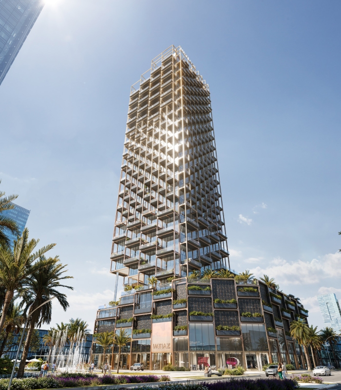 Paneles vidriados y tonos bronce envuelven la fachada para generar espacios interiores luminosos, mientras que los balcones salientes enmarcados por el exoesqueleto proporcionan sombra constante y áreas exteriores habitables durante gran parte del año, incluso bajo las altas temperaturas de Dubái.