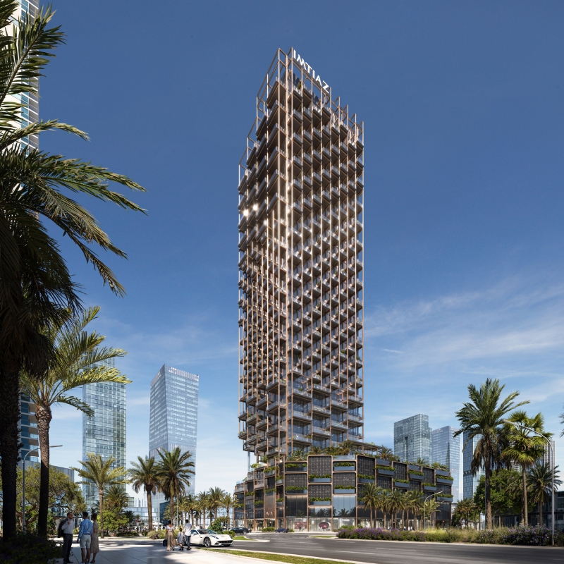 Symphony Tower se construirá mediante un método modular que utiliza acero reciclado y concreto de bajo carbono, lo que reduce de manera significativa el carbono incorporado. La base acristalada se eleva hacia una composición de 42 niveles que culminan en una piscina en la azotea y una serie de terrazas privadas al aire libre, protegidas por la geometría del exoesqueleto.