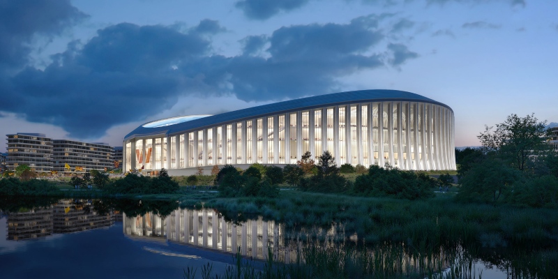 Propone la forma del estadio un perfil cuidadosamente esculpido y transparente, dominado por un tejado abovedado translúcido que establece un diálogo visual con la ciudad, pero evita competir con la altura de los monumentos cercanos.