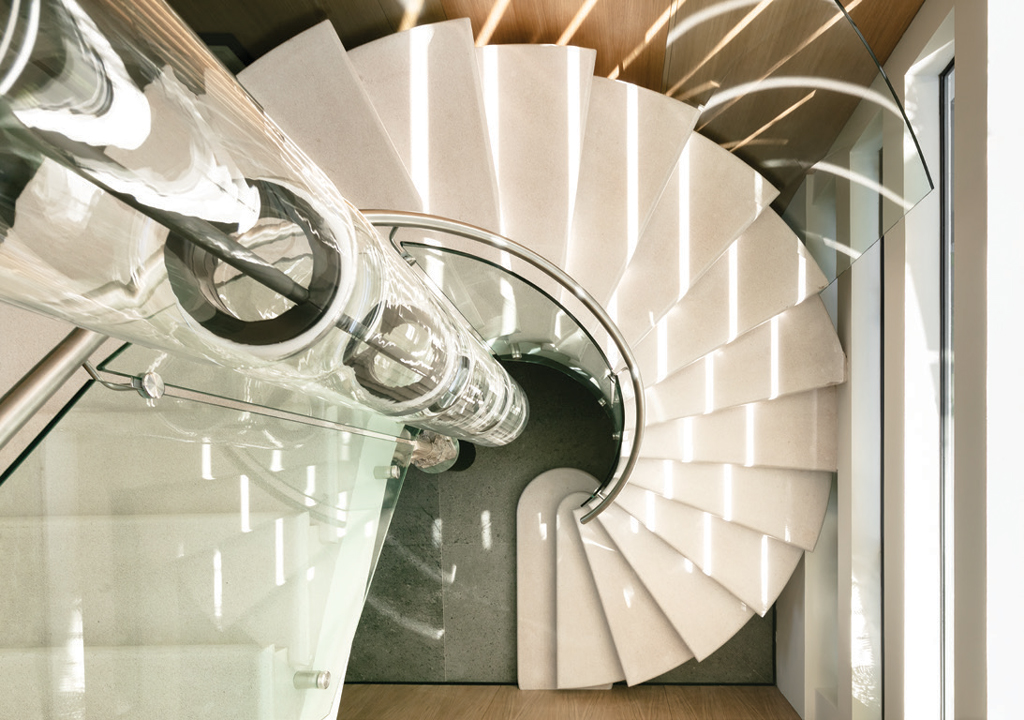 La biblioteca es un espacio de casi 7 metros de altura con un gran librero de placa de acero con iluminación, al cual se accede con una escalera de acero inoxidable y madera que recorre en un riel lo largo del mueble. En su remate tenemos una escalera original de 1944 de terrazo original la cual restauramos, es de forma helicoidal con barandales de curvos de cristal templado. Al centro de la misma una gran lámpara colgante de Flos ilumina el espacio desembarcando en un puente de cristal que une los dos espacios de la casa en planta alta.