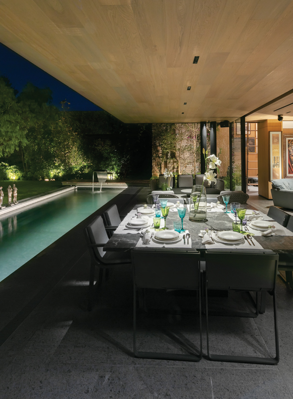 La volumetría de la casa es muy abierta con grandes volados para cubrir las terrazas y para la integración exterior interior. Para los espacios cerrados de las chimeneas y muros conseguimos una piedra rosada muy irregular que trajimos de una mina en el estado de Hidalgo, el material de todos los pisos interiores, exteriores y alberca en un granito Caledonia en formatos de placa muy grande que viene de la India. Los baños, el bar y algunas mesas los hicimos con mármol Grigio Cárnico. La madera de la casa en un Roble Canadiense de tonalidad muy clara, en los pisos y plafones utilizamos el formato enduelado y en los muros un formato de tableros grandes.
