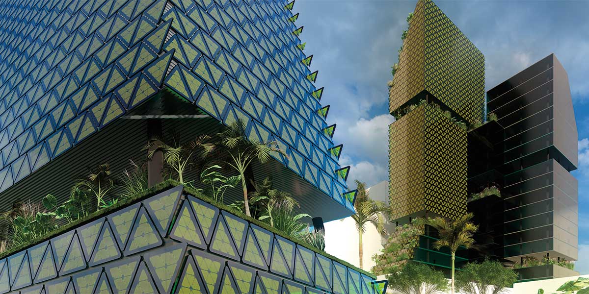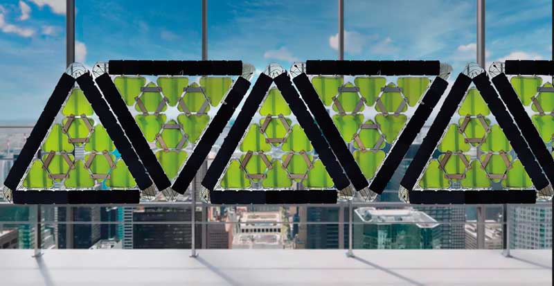 Los biopaneles de Greenfluidics funcionan como si fuera una piel que envuelve cualquier edificación, captando energía solar al implementar vidrio de manera inteligente y sistemas de sombreado automatizados que generan una mayor densidad de construcción, pues se integran como parte de las áreas verdes de los rascacielos, ofreciendo un desarrollo vertical sostenible.