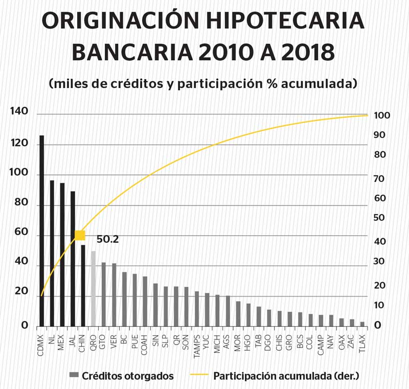 Indicó que si se considera la colocación hipotecario acumulada por la banca entre 2010 y 2018, la Ciudad de México (CDMX), Nuevo León, Estado de México, Jalisco y Chihuahua, concentraron el 50.2% de la colocación a nivel nacional. Le siguieron Querétaro, Guanajuato, Veracruz, Baja California y Puebla.