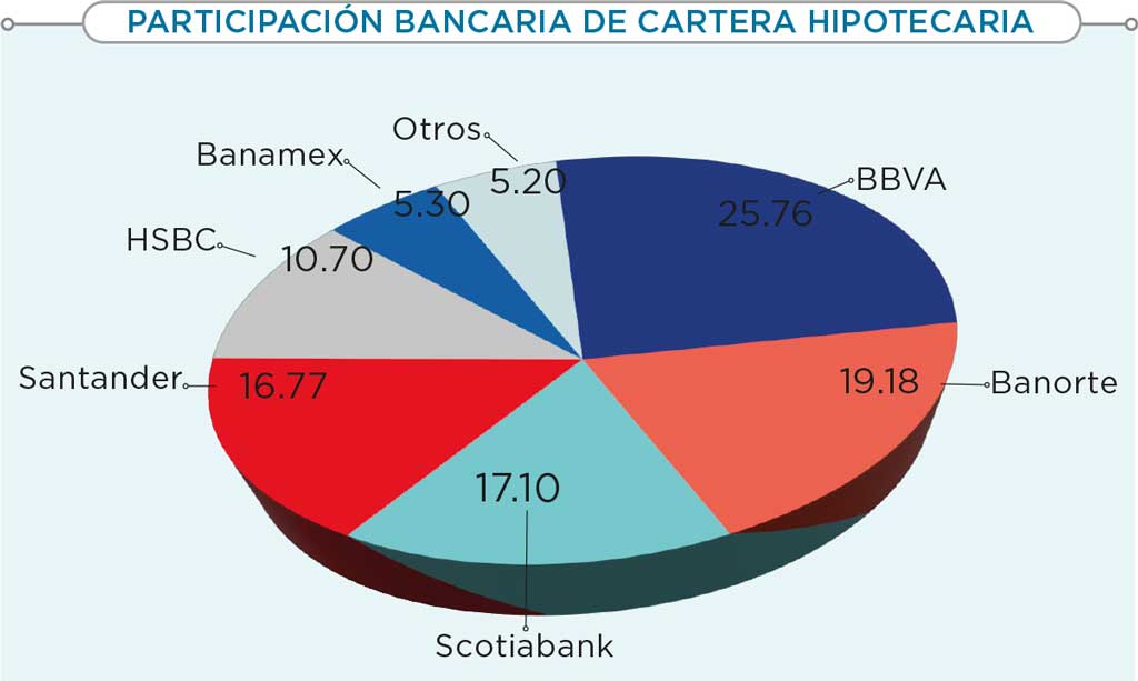El portafolio de la industria hipotecaria del país está integrado por un 51% de participación del Infonavit, 39% por parte de la banca y el 10% restante del Fovissste.