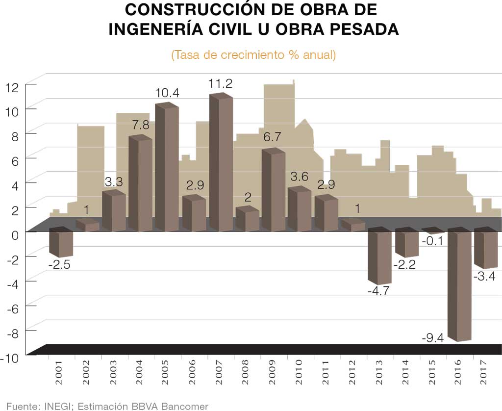 Además agrega que “durante los últimos cuatro años, la edificación ha impulsado a la construcción. En el mismo periodo, la obra civil se ha caracterizado por un desempeño negativo. El efecto neto es que el sector crece cada vez menos conforme la edificación agota sus espacios (…) la obra civil no tendrá una recuperación durante este 2017, pues hay un menor presupuesto para infraestructura y la presión en las finanzas públicas estatales ha llevado a cerrar la oportunidad a más obras. Por otro lado, los proyectos residenciales están por debajo de las 300,000 unidades. La contribución positiva se basará más en la edificación productiva, la construcción de naves industriales y centros comerciales mantendrán el paso durante este año. Esperamos que esto más el incremento (en) el valor de las obras residenciales, sostenga el crecimiento del sector construcción ligeramente por arriba del uno por ciento”.