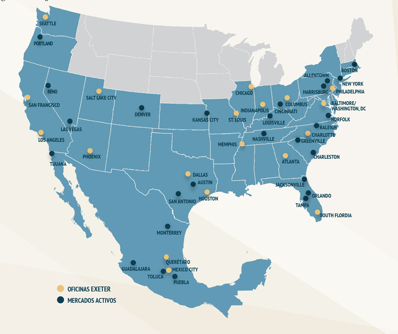 Exeter desarrolla actualmente en el estado de Querétaro y se encuentra constantemente evaluando y estructurando proyectos de inversión en los estados de México, Jalisco (Guadalajara), Nuevo León (Monterrey), Baja California Norte (Tijuana), Puebla y otras ciudades de la Región del Bajío.