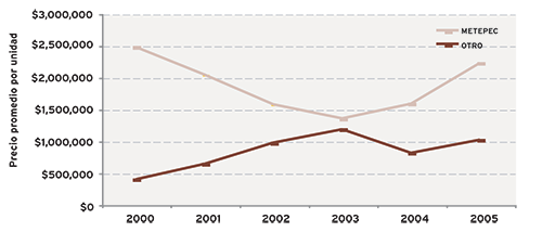 Los precios promedio por unidad en Metepec se han conservado por encima de los precios en otros municipios de la ZM de Toluca. En general, hasta 2004, la ZMT mostraba una relación negativa entre los precios promedio en Metepec y los precios promedio en los otros municipios. En 2004 la tendencia creciente de precios en ambas zonas es patente. Metepec también destaca por ofrecer productos de mayores dimensiones y también precios por metro cuadrado, en promedio, superiores a los precios por metro cuadrado promedio ofertados por los desarrollos de los demás municipios que componen la ZMT.