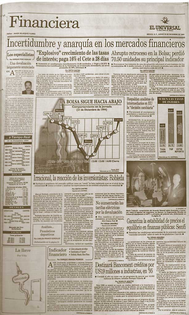 A la vez, fue el inicio de las denominadas crisis recurrentes, cuando se elimina la paridad fija que durante cerca de 22 años mantuvo el tipo de cambio, en 12.5 pesos por dólar de los denominados viejos pesos (0.0125 pesos de los actuales).