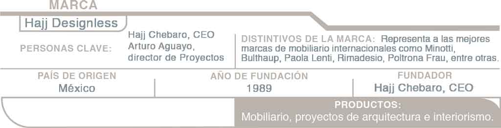Hajj Chebaro creó la marca Hajj Designless; él fue pionero en abrir el mercado del mobiliario europeo a México, obteniendo un éxito rotundo que le ha colocado a la cabeza del Interiorismo en el país. Su primer viaje a México se produjo en 1989, a partir del interés de un cliente mexicano con quien trabajó el primer proyecto para importar muebles. Al llegar, percibió que había un gran potencial, aunque para entonces la introducción del mobiliario era prácticamente imposible. Regresó en 1992, y todavía durante un tiempo siguió realizando proyectos en su taller en Italia. Inmediatamente las personas comenzaron a fijarse en el magnífico mobiliario italiano, y en los ambientes innovadores que realizaba, algo que jamás se había visto en México; en ese tiempo Hajj Chebaro comenzó a llevar arquitectos a Italia, entre los cuales estaban dos figuras emblemáticas para su época: Alfonso López Baz y Javier Calleja.