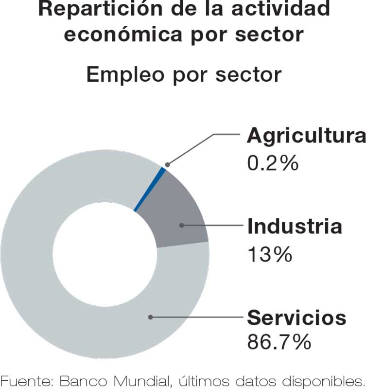 El sector de servicios representa 74% del PIB y emplea a tres cuartas partes de la población activa. El sector bancario representa 8% del PIB. Sectores bien desarrollados y altamente competitivos a nivel mundial como la banca, aseguradoras, fletes y el transporte, contribuyen al desarrollo del comercio internacional.