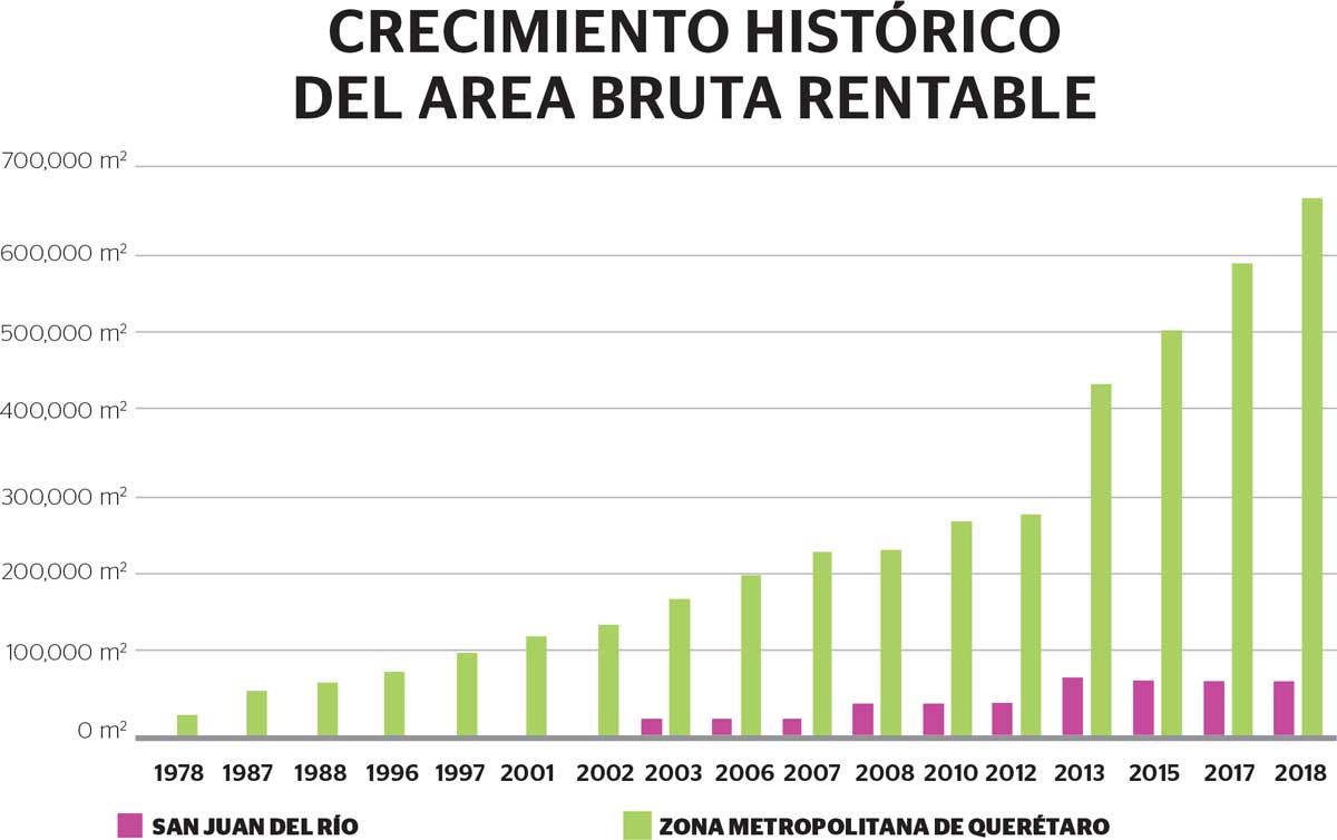 En términos netos, el crecimiento de la superficie comercial rentable en la ZMQ entre 2010 y 2018, fue de 74,000 m² de ABR anuales. Hasta 2012, la ciudad registraba un crecimiento de ABR más bien moderado, y el boom en el sector se presentó en 2013 con el desarrollo de Antea y desde esa fecha el crecimiento anual es de 100,000 m² rentables.