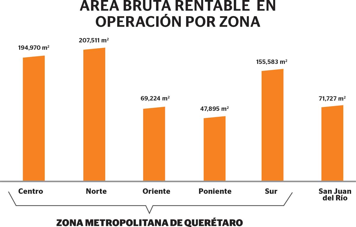 La ZMQ cuenta con una oferta de 21 centros comerciales en operación, que en conjunto suman 675,000 m² de ABR, mientras que en SJR se establecen tres unidades con una superficie de 72,000 m² de ABR. Esta dotación comercial sitúa a la ZMQ en la quinta posición de las ciudades con mayor oferta de área rentable en el país, solo detrás de las tres ciudades más grandes del país y de la ZM de Puebla.