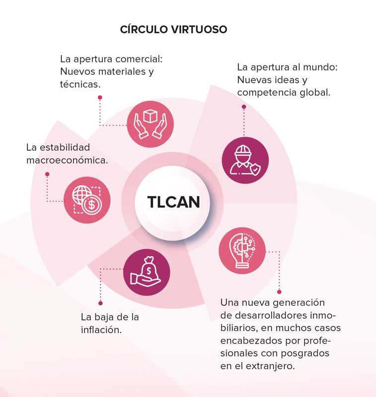 El impulso modernizador del gobierno de Carlos Salinas de Gortari (1988-1994), concretado con la apertura económica y la firma del Tratado de Libre Comercio de América del Norte (TLCAN), se combinó con una serie de factores positivos que crearon el círculo virtuoso que transformó a la industria inmobiliaria en México y fueron: