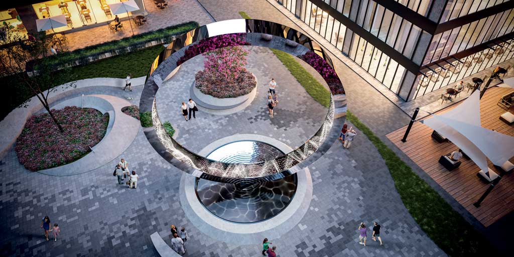 La plaza pública del Cuadran-te ofrece a las personas disfrutar de locales comerciales con acceso directo a espacios ver- des creando una experiencia especial para sus visitantes, buscando transmitir al espectador la relación que existe entre el arte, la ciencia y tecnología con el urbanismo y la movilidad.