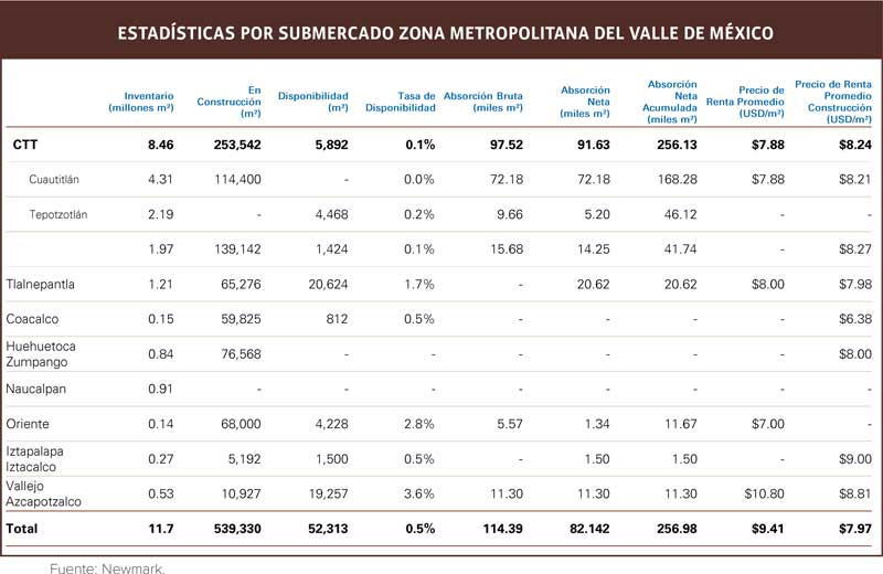 “El pipeline general de construcción se mantiene por encima de los 460 mil m² concentrados en su mayoría en el CTT (76%) con la siguiente distribución: Cuautitlán con el 59% y Tultitlán con 41%, mientras que el 24% restante pertenece a proyectos last mile desarrollados en el corredor de Gustavo A. Madero, Vallejo-Azcapotzalco y Tlalpan. Cabe señalar que el 48% de estos proyectos se encuentran pre arrendados lo que impacta a la absorción bruta”.