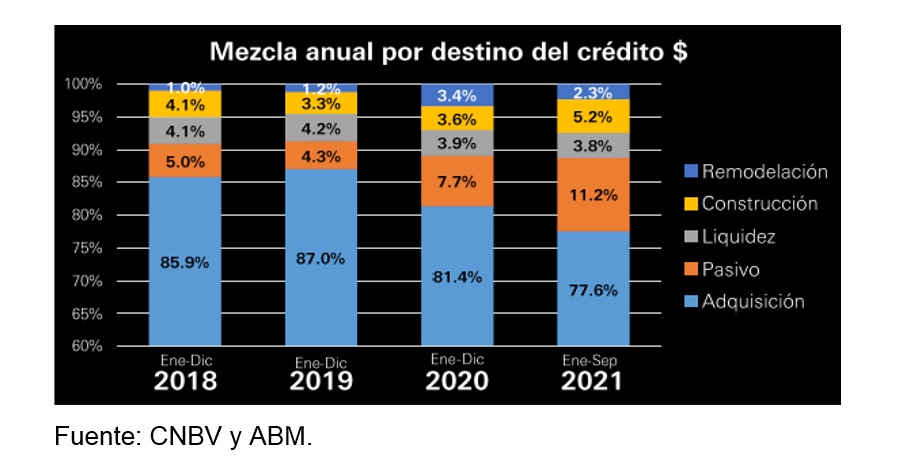 De acuerdo con información de la Comisión Nacional Bancaria y de Valores (CNBV) y la Asociación Mexicana de Bancos (ABM), en los años 2018 y 2019, entre 86 y 87% de la colocación total de crédito hipotecario de la banca tenía como destino el producto para adquisición. Sin embargo, en los años 2020 y 2021 (hasta septiembre) disminuyó a 81.4 y 77.6% del total, respectivamente.
