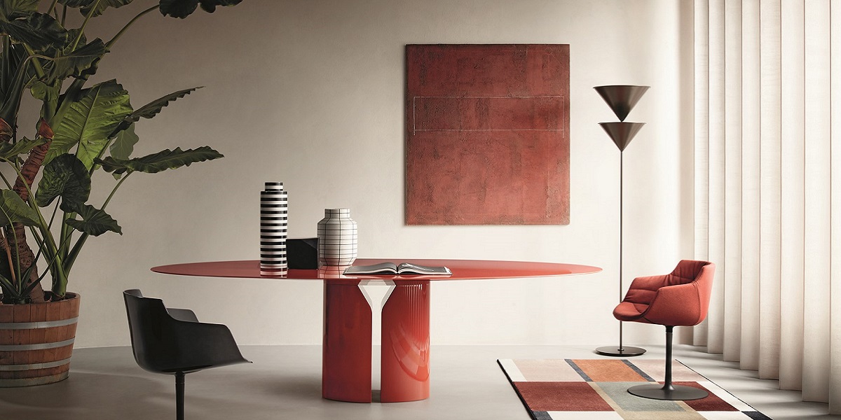 Está disponible en forma ovalada o completamente redonda, y en diez acabados diferentes, siento el mármol el que le da a la pieza un aspecto matérico y con cuerpo; por otro lado, las variantes de lacado brillante y mate le dan un carácter fuerte y decisivo a la mesa.