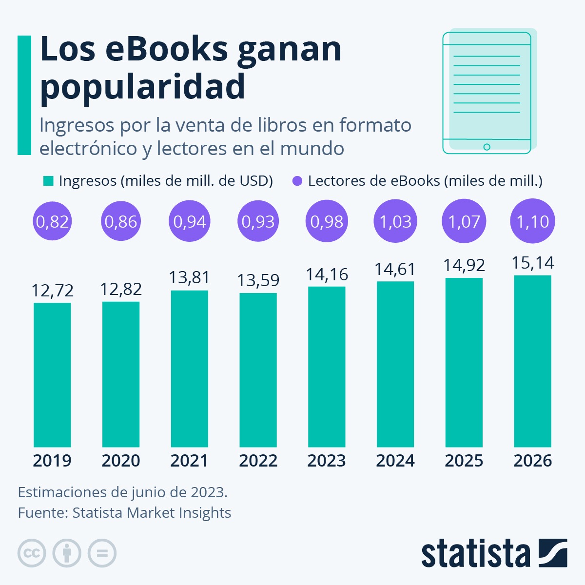 ¿Cuánto factura la industria internacional de los libros electrónicos? Según las estimaciones recientes de Statista Market Insights, la venta de ejemplares en formato digital generará 14,160 millones de dólares (mdd) en 2023, 570 mdd más que el año pasado.