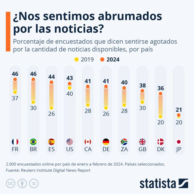 También, España refleja un crecimiento significativo en este sentimiento. En esta nación, el porcentaje subió del 26% en 2019 al 44% en 2024. En Estados Unidos, donde la preocupación por la sobrecarga informativa ya era en 2019 del 40%, el número aumentó ligeramente al 43% en 2024. Japón, por otro lado, muestra la menor variación, con un aumento del 20% en 2019 al 21% en 2024.