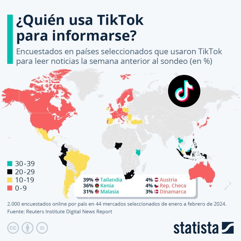 De los 44 mercados encuestados, Tailandia tenía la mayor proporción de encuestados que habían utilizado TikTok como fuente de noticias (39%), seguido de Kenia (36%), Malasia (31%) e Indonesia (29%). Por el contrario, acudir a TikTok en busca de información es mucho menos común en Estados Unidos (9%) y en varios países de Europa (4% en el Reino Unido, Austria y República Checa y solo el 3% en Dinamarca).