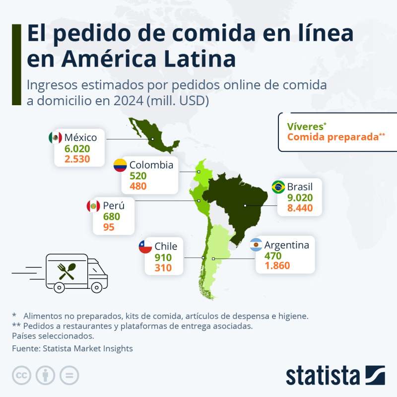 Como muestra el gráfico, este segmento representa una porción significativa de los ingresos por pedidos en línea de alimentos en varios de los principales mercados de la región.
