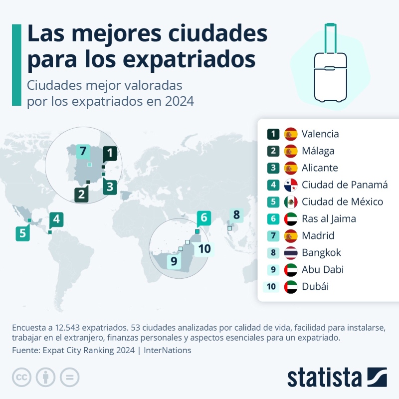 A partir de la encuesta, que ofrece información sobre cinco áreas –calidad de vida, facilidad para asentarse, trabajo en el extranjero, finanzas personales y aspectos esenciales para un expatriado– elaboró el Expat City Ranking 2024.