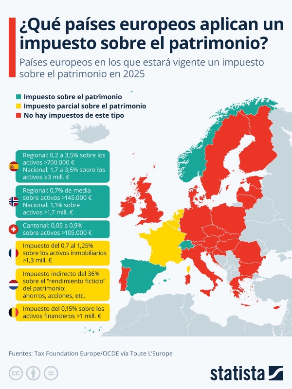Por ejemplo, en España, el impuesto sobre el patrimonio lo gestionan las comunidades autónomas y varía entre el 0.2% y el 3.5% sobre patrimonios superiores a 700,000 euros (820,000 dólares). Además, desde 2022, se ha establecido a escala nacional un nuevo impuesto solidario temporal sobre las grandes fortunas: este afecta a patrimonios de tres millones de euros (3’515,000 dólares) o más, con un tipo impositivo que oscila entre el 1.7% y el 3.5 por ciento.