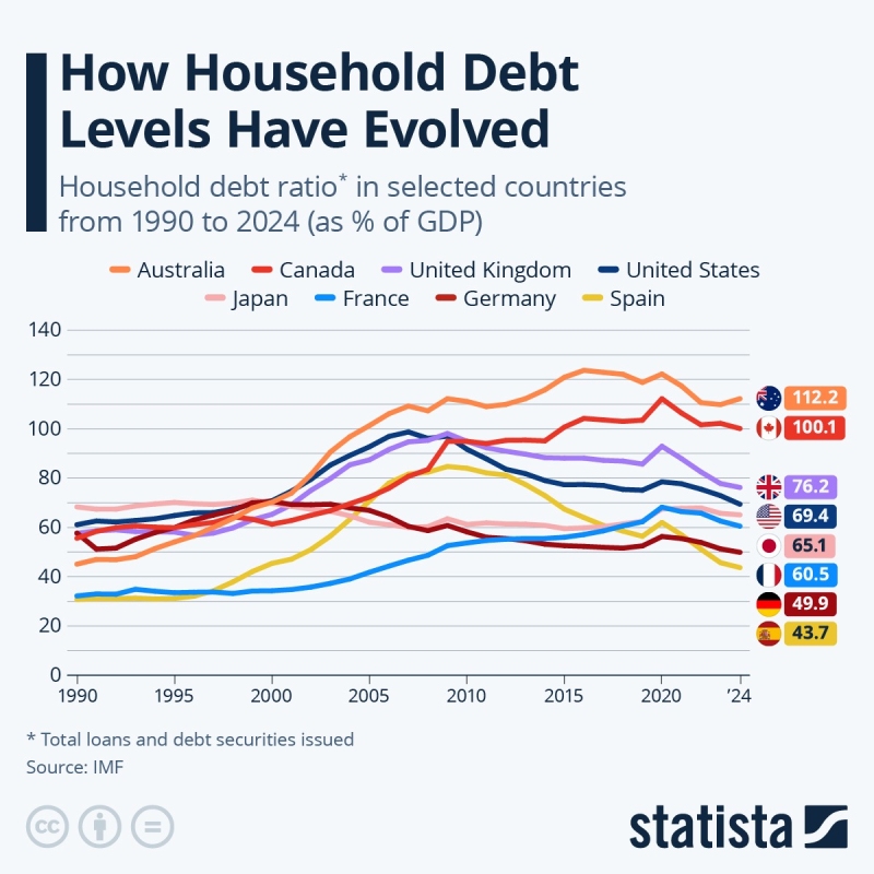En los últimos treinta años, el nivel de deuda de los hogares en relación con el PIB ha aumentado considerablemente en los países de altos ingresos. En las ocho economías analizadas en la infografía, la ratio deuda/PIB promedio ha aumentado del 51% en 1990 al 72% en 2024.