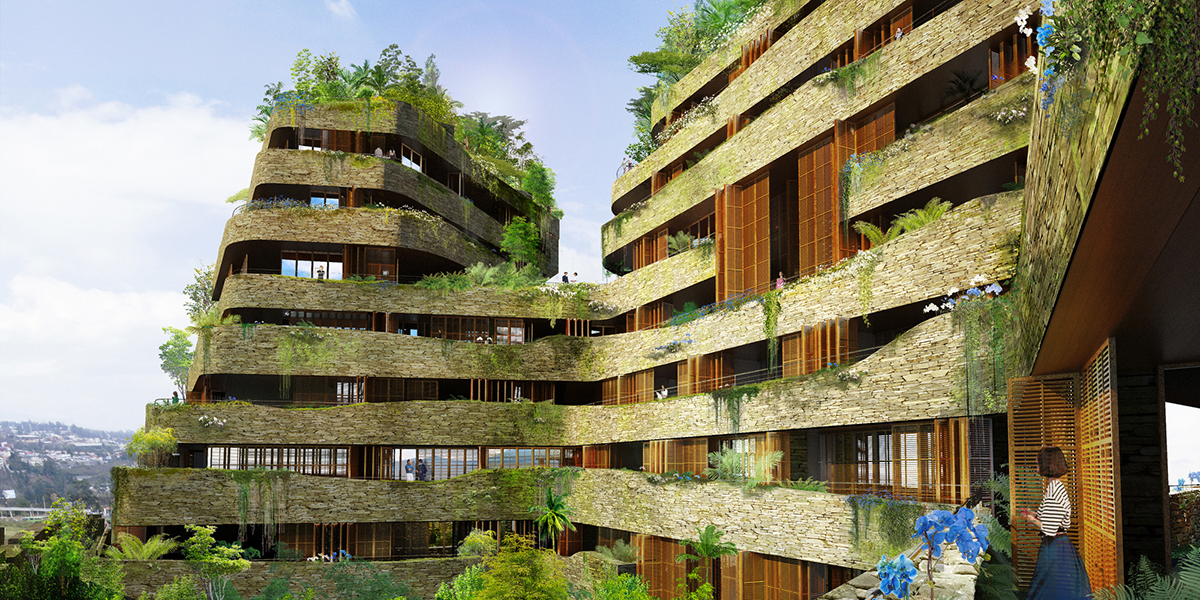 Concebido como un monolito, el complejo residencial de Aquarela −ubicado en el barrio de Cumbayá en Quito, Ecuador− es un proyecto de 136 mil 580 metros cuadrados que se caracteriza por poseer un diseño orgánico que pretende integrarse al paisaje montañoso que lo rodea. Es el resultado de la colaboración entre Ateliers Jean Nouvel y Alberto Medem – Humboldt Arquitectos.