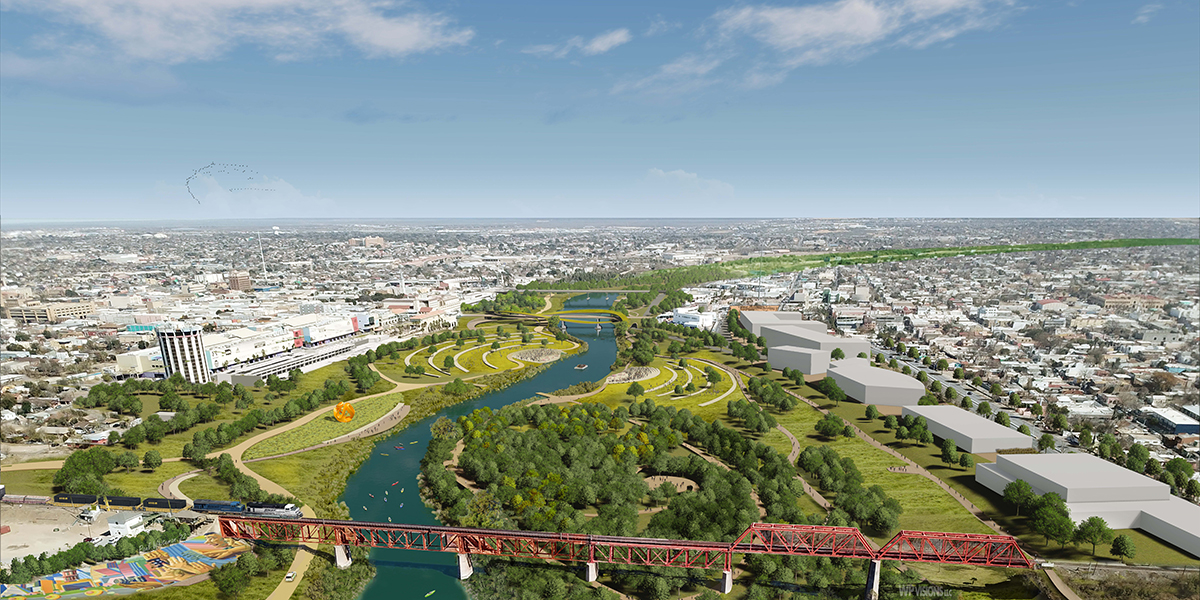La firma Overland Partners, con sede en San Antonio, Texas, publicó el diseño de este parque fronterizo, que se construirá a lo largo del Río Bravo, que conecta con las ciudades de Laredo, en Estados Unidos, y Nuevo Laredo en Tamaulipas, México.