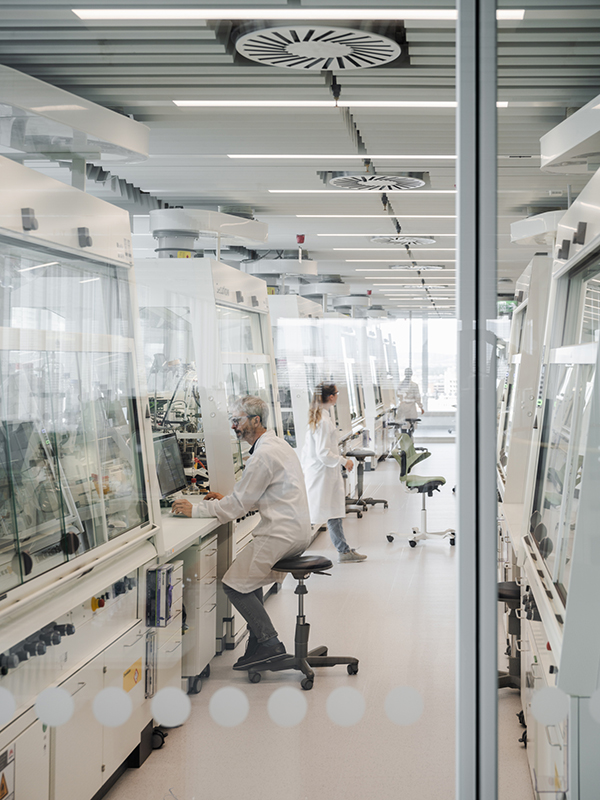 Inspirándose en el trabajo de Salvisberg, Herzog & de Meuron diseñó el cuarteto de edificios como una serie deliberadamente simple de volúmenes blancos que van aumentando en altura desde el centro de convenciones de tres pisos hasta el laboratorio de 23 pisos para mediar entre el vecindario circundante y las torres triangulares vecinas.