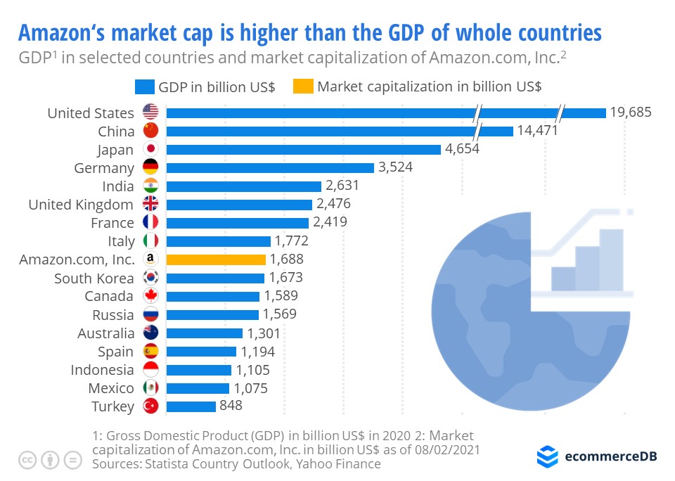 Una comparación con las cifras del PIB de las economías seleccionadas ilustra la importancia de este número y, por lo tanto, el poder económico de Amazon, ya que economías globales fuertes como Italia, Corea del Sur, Canadá y Rusia alcanzaron cifras de PIB de 2020 que son comparables a la capitalización de mercado actual de Amazon.