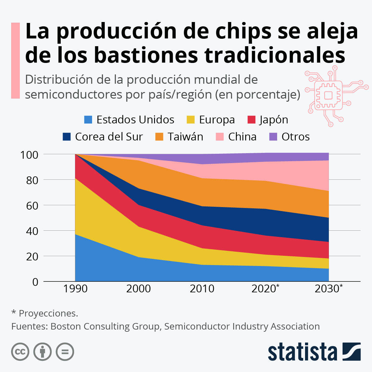 Pero con la irrupción de Corea del Sur, Taiwán y China, a partir de la década del año 2000, las tres regiones que solían liderar en producción se redujeron a una cuota de mercado combinada de sólo 36% durante 2020.