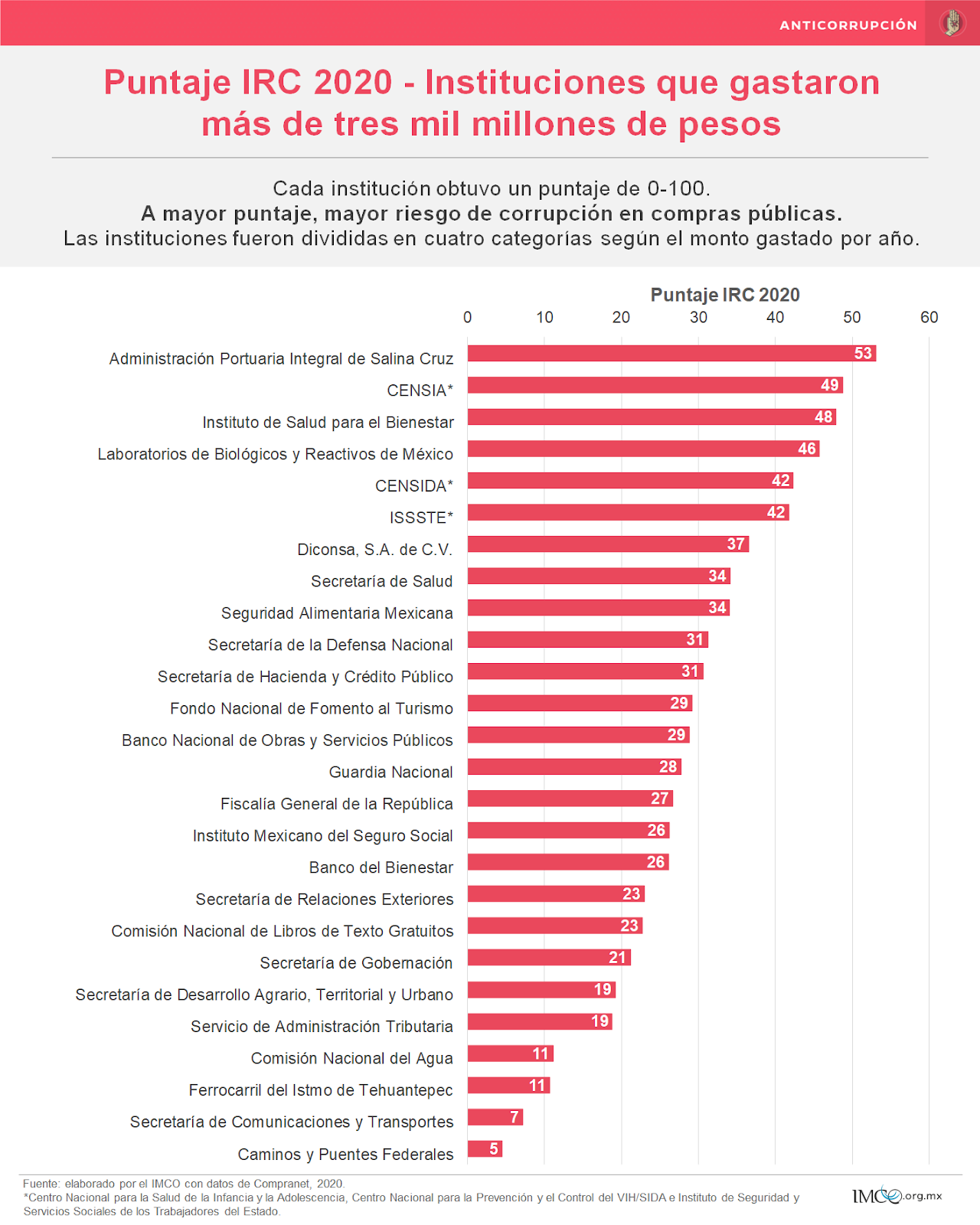 De acuerdo con el Índice de Riesgos de Corrupción (IRC), entre el 2018 y el 2020 aumentó el riesgo de corrupción en las compras públicas en 147 instituciones federales de México, un 59% más debido a la falta de competencia, poca transparencia e incumplimiento de la ley.