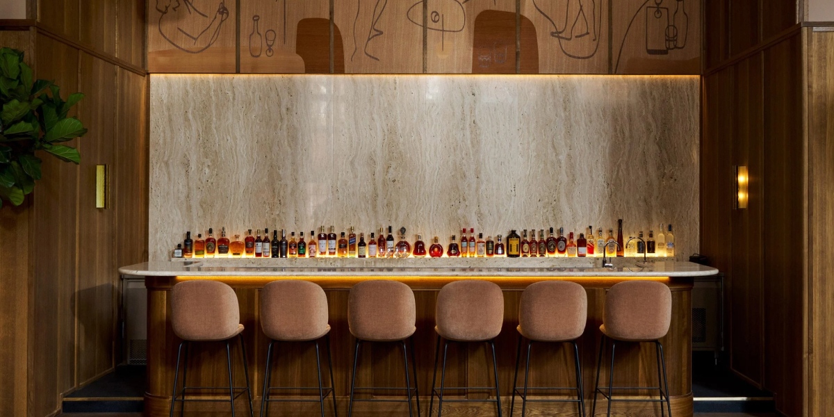Introduce el travertino blanco y gris una materialidad atemporal que actúa como puente entre el restaurante y el club de jazz. Muebles diseñados por el propio estudio —como la emblemática Beetle Chair y la refinada silla de violín para Gubi— habitan el espacio con intención, suavizando la acústica y reforzando el carácter envolvente del lugar.