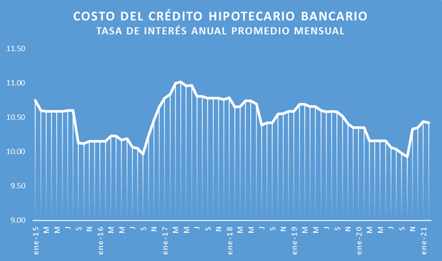 Al cierre de 2020 el “Indicador del Costo de Créditos Hipotecarios” que publica Banxico se ubicó en 10.35% promedio, exactamente igual que al cierre de 2019, lo que significó un repunte de 42 puntos base respecto al promedio mínimo de octubre. Con el nivel establecido hasta febrero de 2021, el repunte acumulado es de 49 puntos base respecto al mínimo.