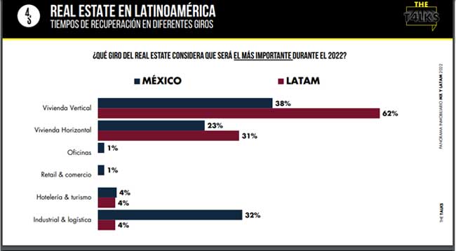 Según la perspectiva de desarrolladores y especialistas de la región, el giro que más se ha recuperado en Latinoamérica al arranque del 2022 es la vivienda vertical, seguida de la vivienda horizontal, mientras que el industrial y logístico se posiciona en tercer lugar. Posteriormente, en cuarta posición ubican al retail y comercio, en tanto la hotelería y turismo ocupan la quinta posición, sobre todo lo que se refiere a business class, que es un mercado que viene muy aletargado y a la baja de forma significativa.