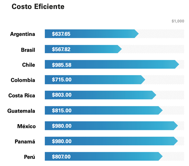 El costo por categoría ‘Eficiente’ varía desde el más barato de 715/USD/m²/mes, hasta los 985/USD/m²/mes. En la categoría ‘Estándar’, los costos van desde los 877/USD/m²/mes en Brasil, hasta los mil 328 /USD/m²/mes en Guatemala, y el costo en categoría ‘Premium’ está entre los mil 234 /USD/m²/mes en Brasil y los 2 mil 100/USD/m²/mes en Perú.