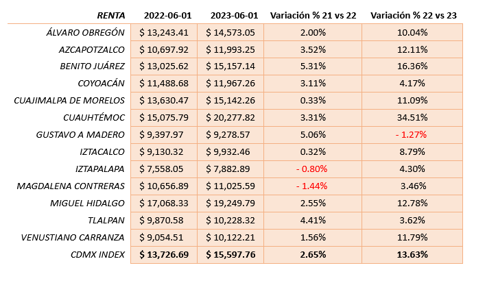 La alcaldía Cuauhtémoc fue la que tuvo un significativo aumento en los costos de renta con un 34.5% en el periodo enero-junio de 2022 vs 2023. Le sigue Benito Juárez con 16.3% y Azcapotzalco con 12.1% de alza.
