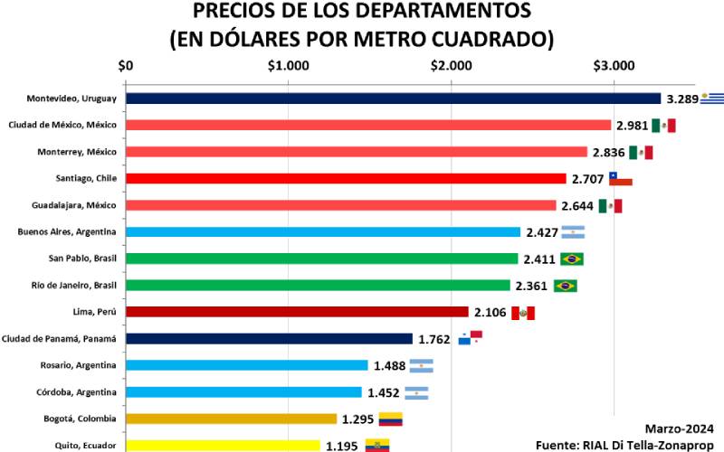 Montevideo, Uruguay; y la Ciudad de México (CDMX) son las ciudades con el metro cuadrado más caro de América Latina con un precio de $3,289 dólares y $2,981 dólares respectivamente.