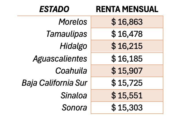 Con base en los anuncios publicados en el portal de clasificados online de real estate en México, los costos de renta se distribuyen en varios rangos. Los más bajos, de entre $5,000 y $11,000 pesos, se encuentran en estados como Tlaxcala, Zacatecas, Durango, Chiapas y Campeche. En el siguiente rango, entre $15,000 y $16,000, están estados como Sonora, Sinaloa, Baja California Sur, y Aguascalientes.