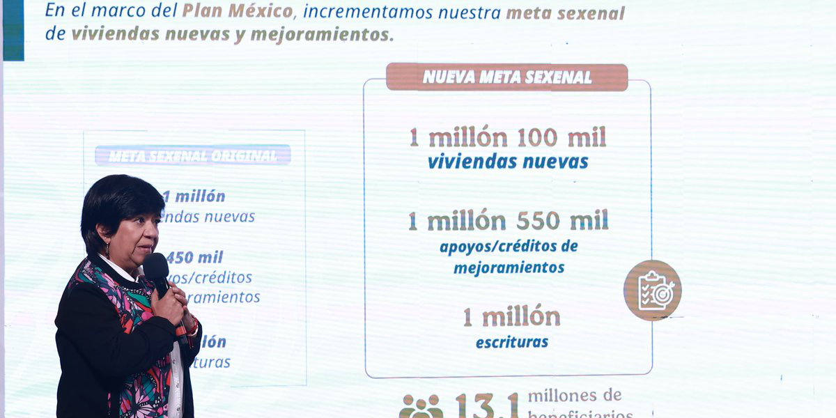 La funcionaria informó que, por instrucciones presidenciales, se incrementó de un millón a 1.1 millones el objetivo sexenal de construcción de vivienda nueva, así como de un millón a 1.55 millones las acciones de mejoramiento y ampliación de viviendas en todo el país.