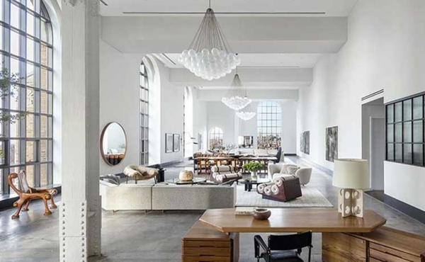 The windowed entrance gallery leads to one of the largest living rooms in New York City, measuring almost 100-feet long by over 30-feet wide, housing one of the longest continuous art walls in any private home. The soaring 21-foot ceilings and the dramatic arched windows frame the iconic views of the New York City skyline, Statue of Liberty, and Hudson River.