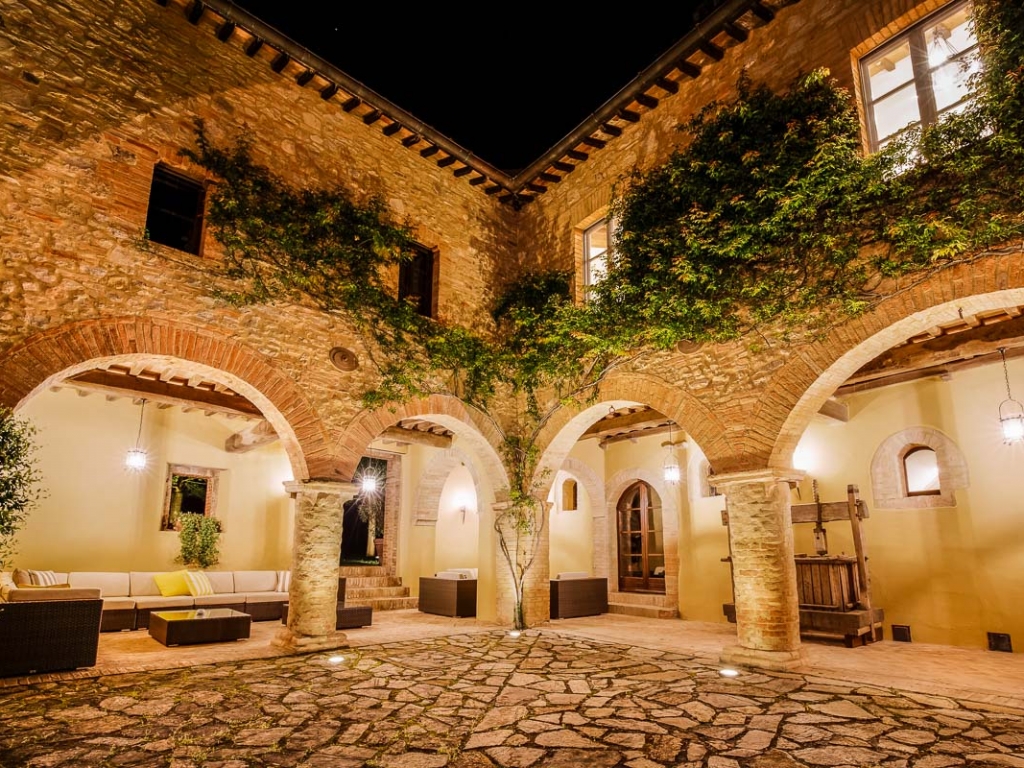 The villa is arranged around a central piazza that was once the village square. Groups can gather in the courtyard, indoor and outdoor dining areas, conference facility, ballroom, media room, wine-tasting room and teaching kitchen. Or everyone can spread out and enjoy the garden, pool, library, gym, piano and video games. No detail has been overlooked; the villa even has voltage adapters, air conditioning and Wi-Fi access, and staff to assist with anything else.